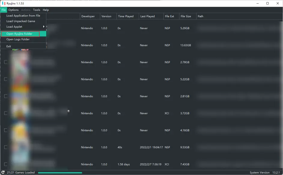 在Ryujinx模拟器中选择File -> Open Ryujinx Folder