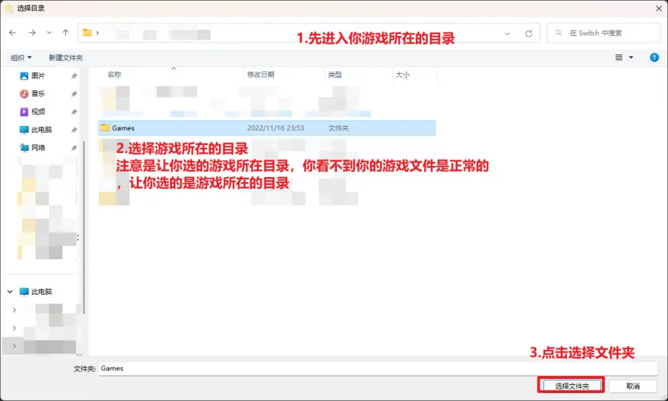 注意!!!这里选择游戏所在的目录就行了,不是让你选的游戏,是让你选的游戏所在目录,你看不到你的游戏文件是正常的,让你选的是游戏所在的目录