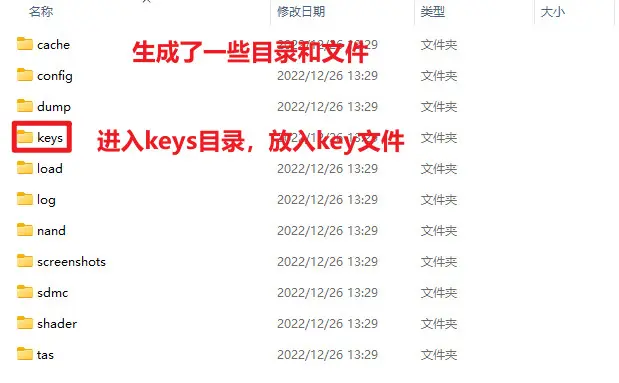 进入keys目录,把key文件(一般包括prod.keys和title.keys,请到评论置顶下载key文件)放进去