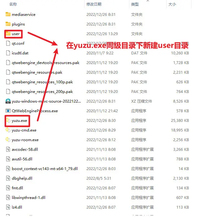 2.进入解压的目录,在yuzu.exe的同级目录下,新建user目录
