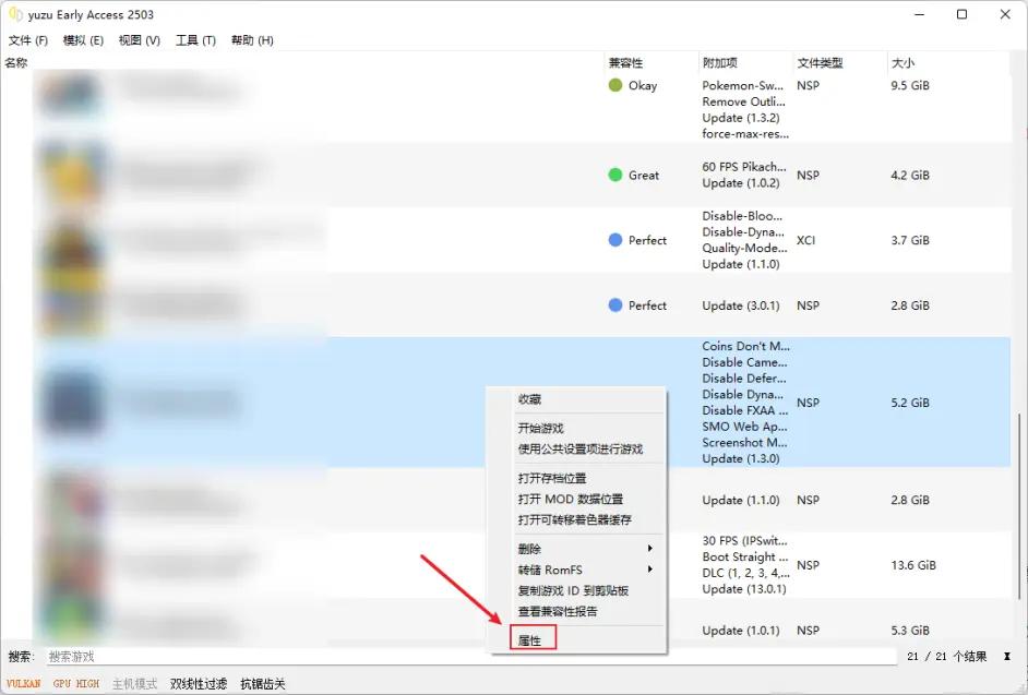 鼠标右键某个游戏,选择属性,即可查看游戏属性,并且可以在这里启用或者关闭dlc、mod、update