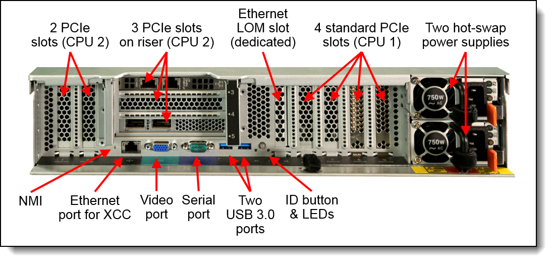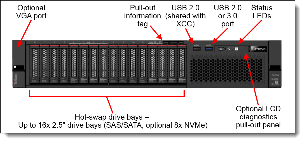 | 端口 | 正面:两个USB 2.0端口或一个USB 2.0和一个USB 3.0端口,取决于型号。可以将第一个USB 2.0端口配置为通过使用USB电缆连接的移动设备上的XClarity Administrator移动应用程序来支持本地系统管理。可选的前VGA视频端口(CTO或现场升级)。 后部:两个USB 3.0端口,一个VGA视频端口,一个DB-9串行端口和一个RJ-45 XClarity控制器(XCC)系统管理端口。串行端口可以与XCC共享以实现串行重定向功能。 内部:支持一个或两个M.2驱动器的专用插槽中的可选M.2适配器(用于OS引导支持,包括管理程序支持)。 |