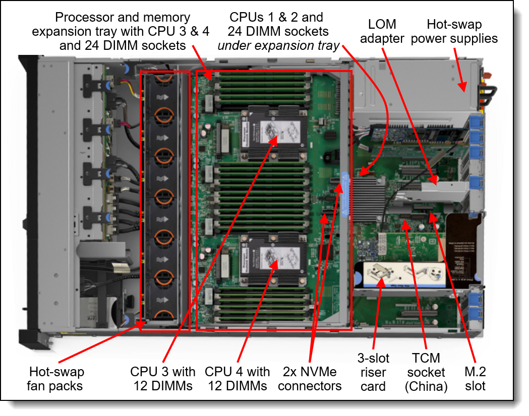 | 记忆 | 最多48个DIMM插槽(每个处理器12个DIMM),支持最高2666 MHz的Lenovo TruDDR4 DIMM。支持RDIMM,LRDIMM和3DS RDIMM,但不能混合使用内存类型。系统板上有24个DIMM插槽,处理器和内存扩展托盘上有另外24个DIMM插槽(大多数型号标准配置)。 |