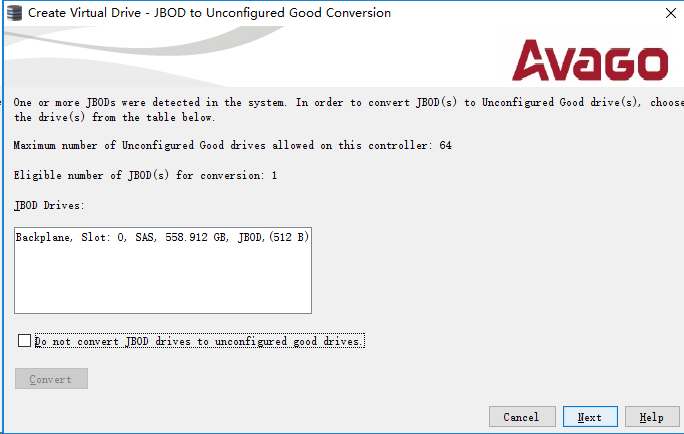 如要转换,则选中相应的硬盘,并点击"Convent"按钮;如不转换,则勾选"Do not convent JBOD...",再点击"Next"下一步。