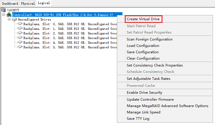 右键点击阵列卡型号,再点击"Create Virtual Drive"