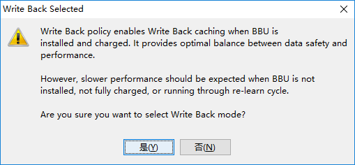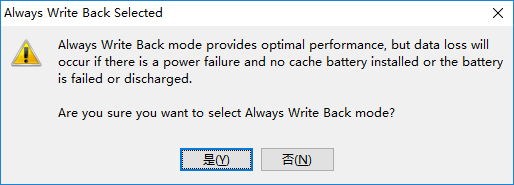 Always Write Back 强制回写模式:不论是否配备有电池、超级电容,以及其状态是否正常,都强制使用回写模式。此时能提供最佳的读写性能,但数据丢失风险最高。