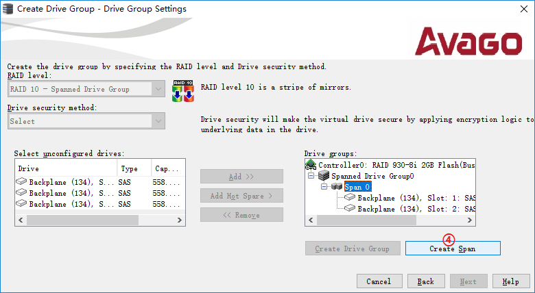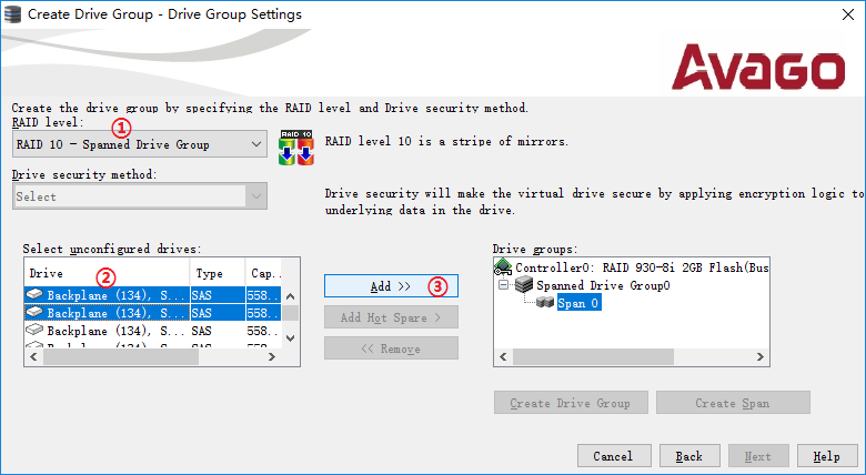 RAID10/50/60阵列是由两组或以上的Span组成的阵列(Drive Group),在"Drive Group Settings"中需要做create span相关操作。