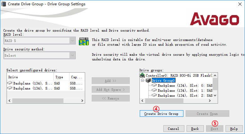 以创建由4个硬盘组成的RAID5阵列为例。"RAID Level"选择"RAID 5",在"Select unconfigured drives:"中选中硬盘(可按Shift键或者Ctrl键同时选中多个硬盘),再点击"Add >>"按钮添加到"Drive groups:"中。