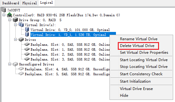 在Logical标签页中,右键点击要删除的Virtual Drive,选择"Delete Virtual Drive"。