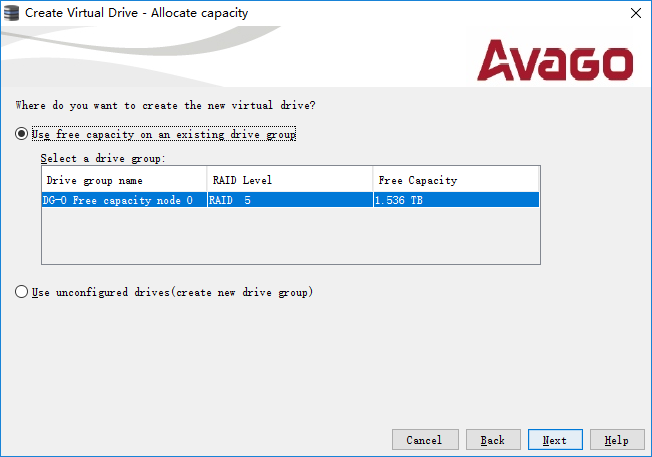如果在已创建的阵列(Drive Group)中还有剩余空间(Free Capacity),可以再新建卷。