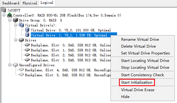 如果在创建RAID阵列时没有执行初始化操作,或者需要抹除已有卷中的数据,则在Logical标签页中,右键点击要进行初始化的Virtual Drive,选择"Start Initialization"。