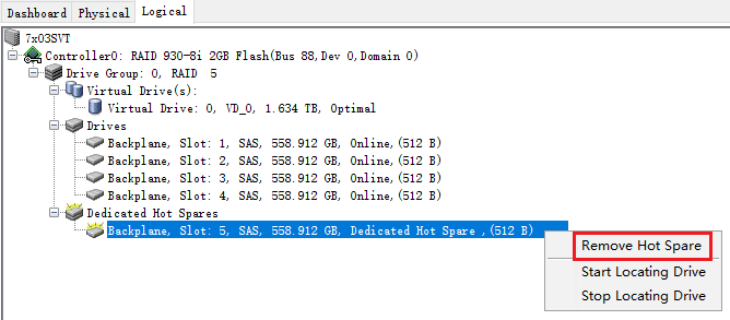 如要删除热备盘,在热备盘上点右键,点击"Remove Hot Spare"移除热备盘。