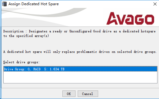 设置专用热备盘需要选择分配到的阵列(Drive Group),选择与之规格一致的阵列,可以选择多个阵列,点击"OK"完成。