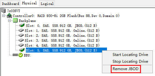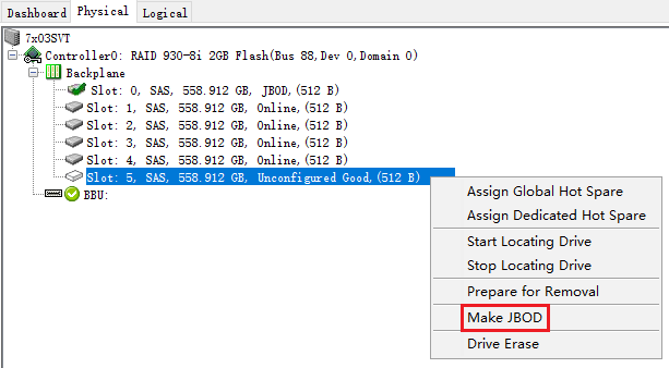 在Physical标签页中,右键点击状态为Unconfigured Good的硬盘,点击"Make JBOD"。