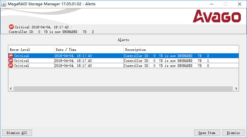 当阵列或者硬盘处于非正常状态时,登陆MSM工具会有报警提示。