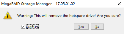 删除热备盘会有确认提示,勾选""复选框后继续。