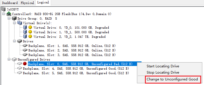 在Physical或者Logical标签页中,右键点击状态为Unconfigured Good的硬盘,