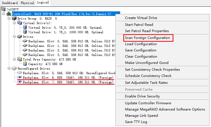 然后右键点击RAID卡型号,点击"Scan Foreign Configuration"扫描外来配置信息。