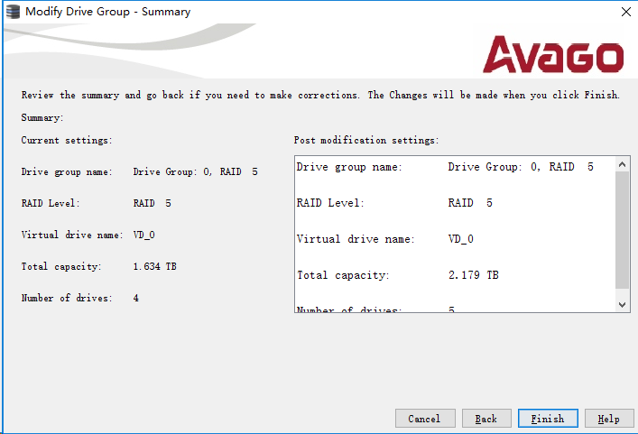 确认操作,左侧是现有的阵列属性状态,右侧是扩容后的属性状态。点击"Finish"结束向导,并开始扩容阵列。