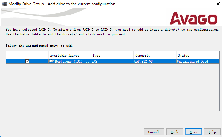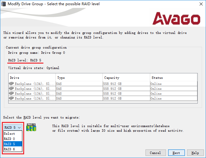 如不改变级别,则在"Select the RAID level you want to migrate"中选择与当前RAID level一致的;