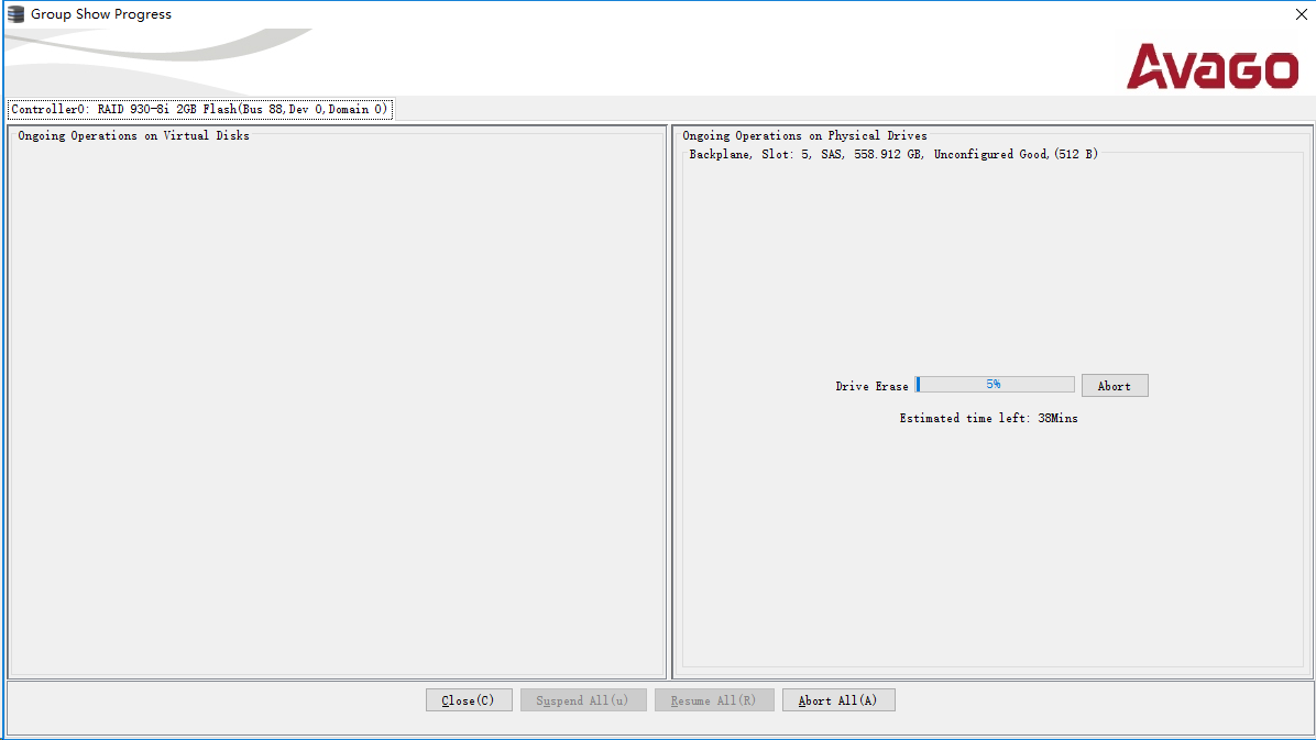 随后即开始擦除硬盘。同前述重建修复阵列,可以在Dashboard中看到进度提示。