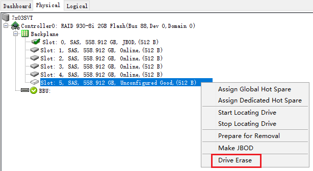 在Physical标签页右键点击要擦除的硬盘,点击"Drive Erase"擦除硬盘。