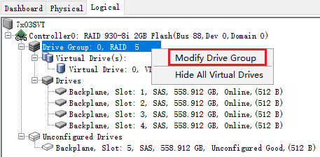 在Logical标签页中右键点击要扩容的阵列(Drive Group),点击"Modify Drive Group"调整阵列。