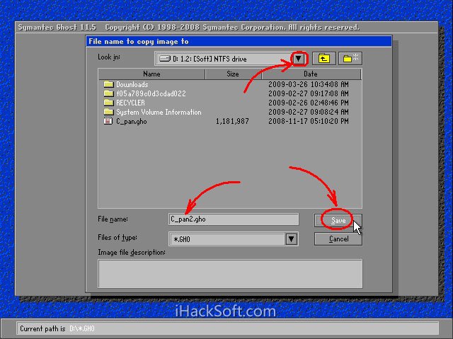 4.1、此时弹出存储位置对话框,单击黑三角按钮,在下拉列表中选择要存储镜像文件的分区(注意:要确保该分区有足够的存储空间),进入相应的文件夹(注意:要记准存放镜像文件的文件夹,否则恢复系统时将难以找到它),在“File name”(意为:文件名)处输入镜像文件的文件名,输好文件名后,单击“Save”(意为:保存)按钮继续操作。