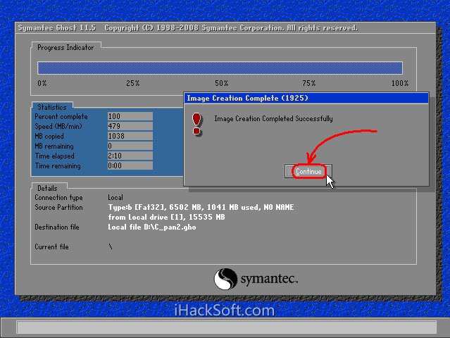 8、弹出创建成功窗口,如下图。至此,系统已经备份完毕,后面的步骤不重要了。单击“Continue”即回到Ghost初始界面。