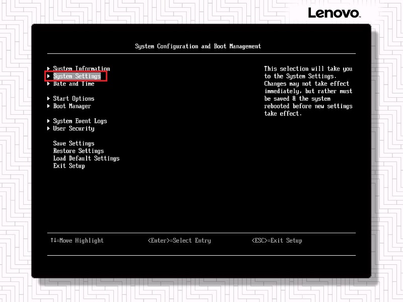 启动服务器,在出现Lenovo System x logo的时候按F1键进入UEFI Setup界面;