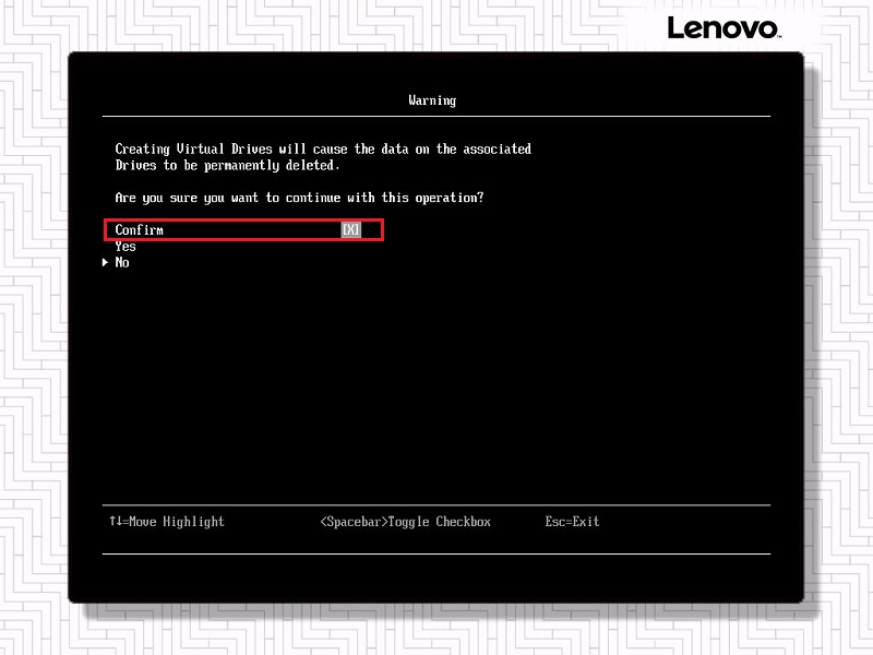联想各系列服务器的UEFI HII界面有所不同,System x系列服务器在最终确认(如创建阵列、清除阵列、重新初始化阵列)时,要在""上按空格键,使右侧"[ ]"变成"[X]",然后再选择"Yes"。
