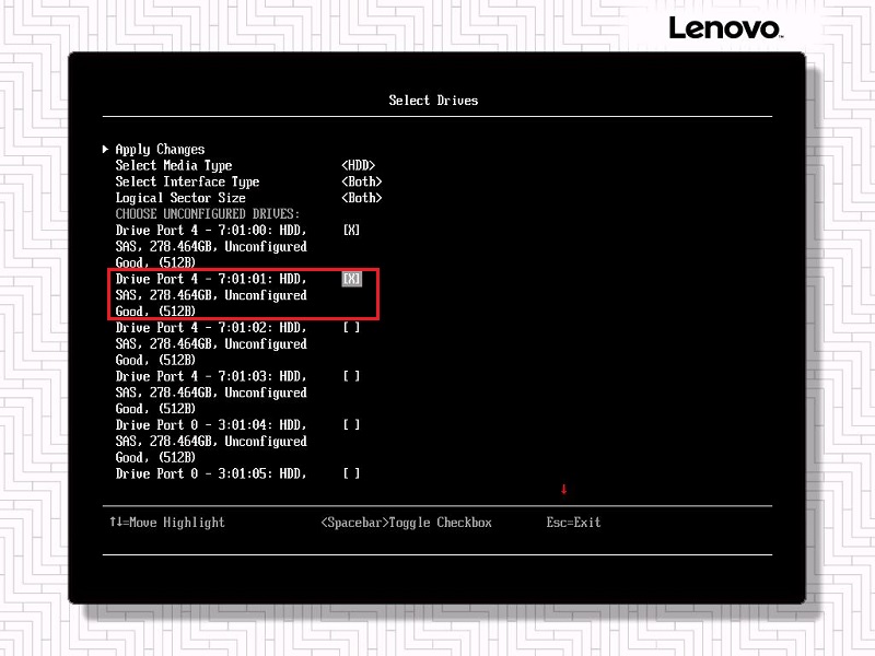 联想各系列服务器的UEFI HII界面有所不同,System x系列服务器在选择硬盘(如创建阵列)时,要在选中的硬盘上按空格键,使右侧"[ ]"变成"[X]"。