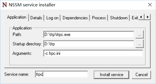 Application Path: 选择frpc.exe Arguments:填入-c frpc.ini Service name:服务的名称