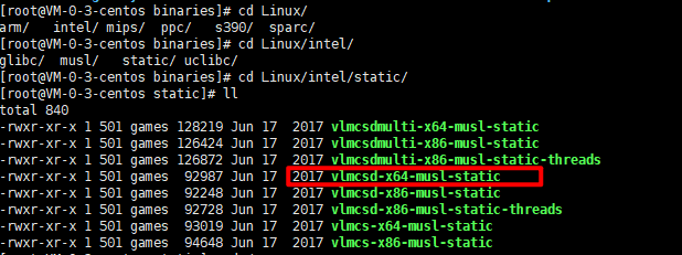 进入 binaries/Linux/intel/static目录下,可以看到里边有多个安装程序,选择匹配自己系统的安装,执行安装程序。(这里我选用的是vlmcsd-x64-musl-static)