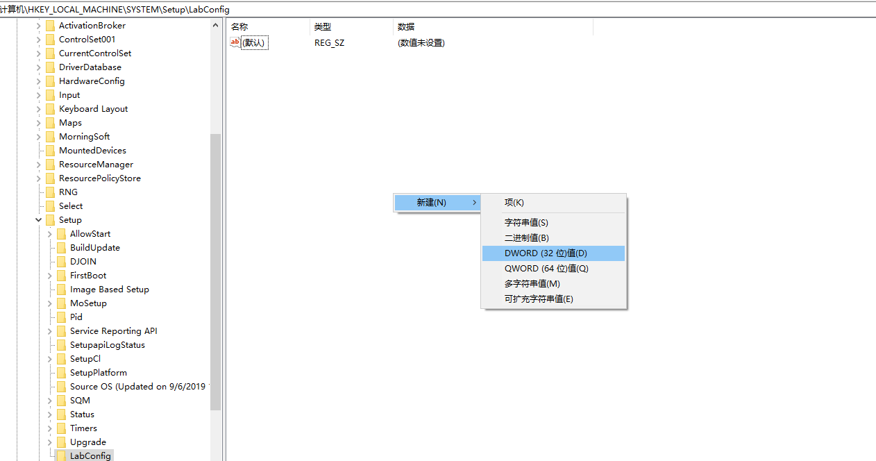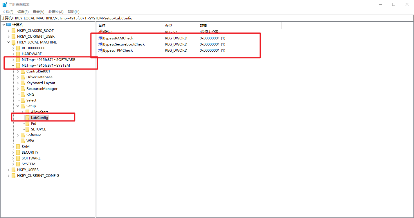 进入计算机\HKEY_LOCAL_MACHINE\NLTmp~794e56662~SYSTEM\Setup,新建LabConfig项