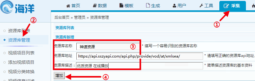 SeaCms(海洋CMS)教程 admin 2022-06-10 11:30 517 人阅读 0 条评论 本站采集插件已经可以适配海洋CMS,支持M3U8在线播放和下载资源的采集,快速更新,稳定播放! 警告海洋cms需要重新绑定分类,否则数据会错乱!请务必将图片同步到本地,图片失效概不负责!如何使用快捷菜单采集请按以下步骤进行:依次点击【采集】-【资源库管理】,然后依次输入资源库名称:神速资源 神速资综合源库地址:https://api.sszyapi.com/api.php/provide/vod/at/xmlsea/ 神速yun源库地址:https://api.sszyapi.com/api.php/provide/vod/from/ssyun/at/xmlsea/ 神速资m3u8源库地址:https://api.sszyapi.com/api.php/provide/vod/from/ssm3u8/at/xmlsea/ 点击【增加】按钮即可,具体操作如下图或在您的快捷菜单中添加 播放暂没有数据?有的会员朋友采集资源后,播放片源没有自动选择对应的数据,这种情况通常是因为没有添加对应的播放器导致!需要先再网站后台添加对应的播放器,然后再安装对应的播放器文件,才可以实现播放,以ssm3u8的资源为例此时因为我们添加了播放器,将不再提示暂没有数据,但是可能依旧不能播放,下载解析包替换js\player目录中的文件即可【点击下载】如果您的版本号小于8.7请【点击下载】此处 本文地址:https://www.liuchunjie.top/?id=355 版权声明:本文为原创文章,版权归 admin 所有,欢迎分享本文,转载请保留出处! 点赞 分享: PREVIOUS:AIX详细的VG,LV扩容步骤 NEXT:redhat7安装Oracle19CRAC 文章导航