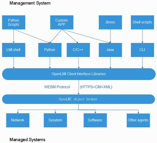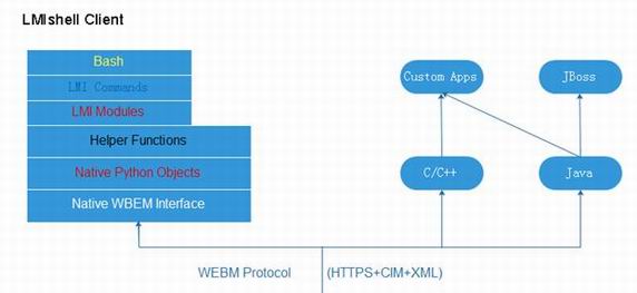 LMIshell,这是一个客户端客户端程序,它的作用是通过 OpenLMI object broker 來调用 LMI Providers。这个客户端通过使用 WBEM + HTTPS 协议访问 CIMOM。其中 LMIshell 客户端系统包括: