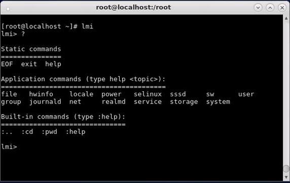 说明 : 不同的 Linux 发行版本支持的子命令数量有差异,其中数量最多功能最全的是 Fedora 21。用户在终端下输入 lmi 进入交互环境,然后输入“?”或者 help 命令可以得到子命令列表和其他帮助信息见图 3 。图 3 输入“?”或者 help 命令可以得到子命令列表