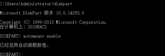 首先我们到diskpart里激活磁盘的automount,激活automount后,连接的卷会自动联机,这步两台都运行