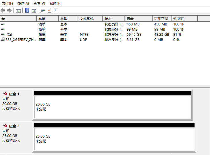 然后就可以看到磁盘管理中有两块联机且未分配的硬盘