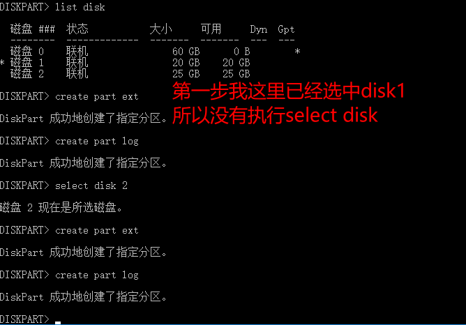 然后可以在两台服务器上的diskpart里都执行list disk和list vol查看磁盘和卷