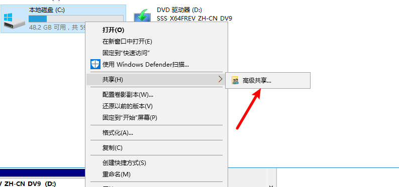 右键C盘,设置共享>高级共享