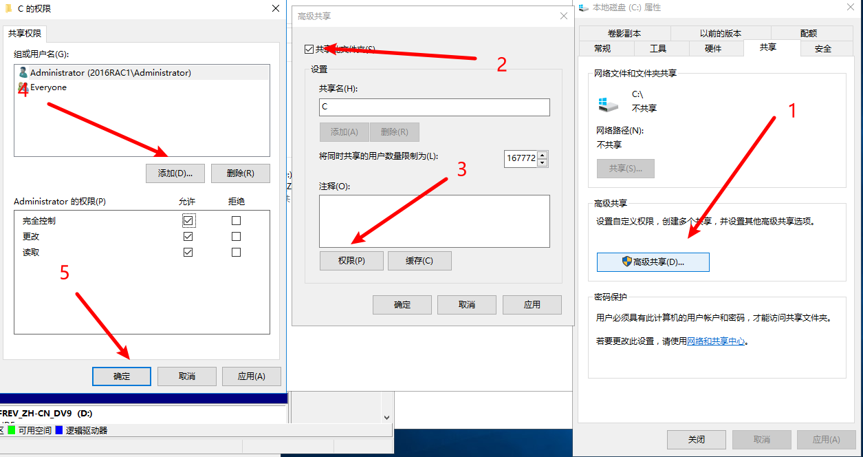 我这里只有C盘,所以就只需要设置C盘共享,如果更改oracle安装目录,还需要自行修改