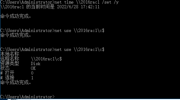 在2016rac1上执行两遍net use \\2016rac2\c$
