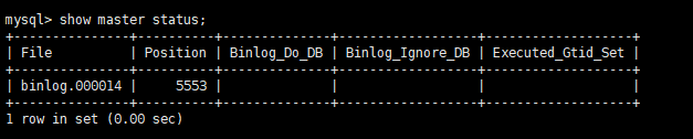 mysql> show master status; +---------------+----------+--------------+------------------+-------------------+ | File | Position | Binlog_Do_DB | Binlog_Ignore_DB | Executed_Gtid_Set | +---------------+----------+--------------+------------------+-------------------+ | binlog.000014 | 5553 | | | | +---------------+----------+--------------+------------------+-------------------+ 1 row in set (0.00 sec)