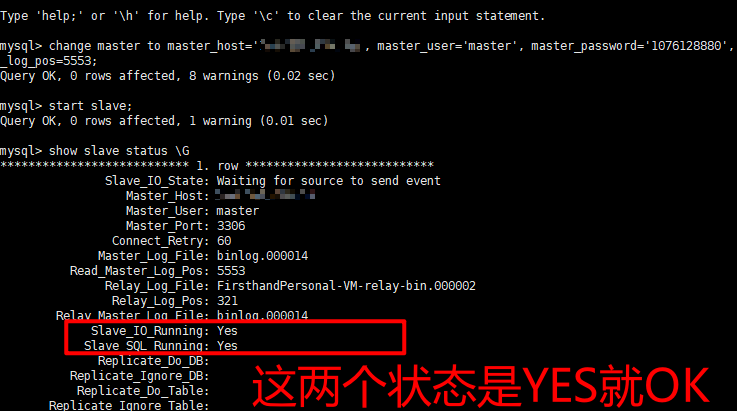 mysql> start slave; mysql> show slave status \G *************************** 1. row *************************** Slave_IO_State: Waiting for source to send event Master_Host: ip Master_User: master Master_Port: 3306 Connect_Retry: 60 Master_Log_File: binlog.000014 Read_Master_Log_Pos: 5553 Relay_Log_File: FirsthandPersonal-VM-relay-bin.000002 Relay_Log_Pos: 321 Relay_Master_Log_File: binlog.000014 Slave_IO_Running: Yes Slave_SQL_Running: Yes