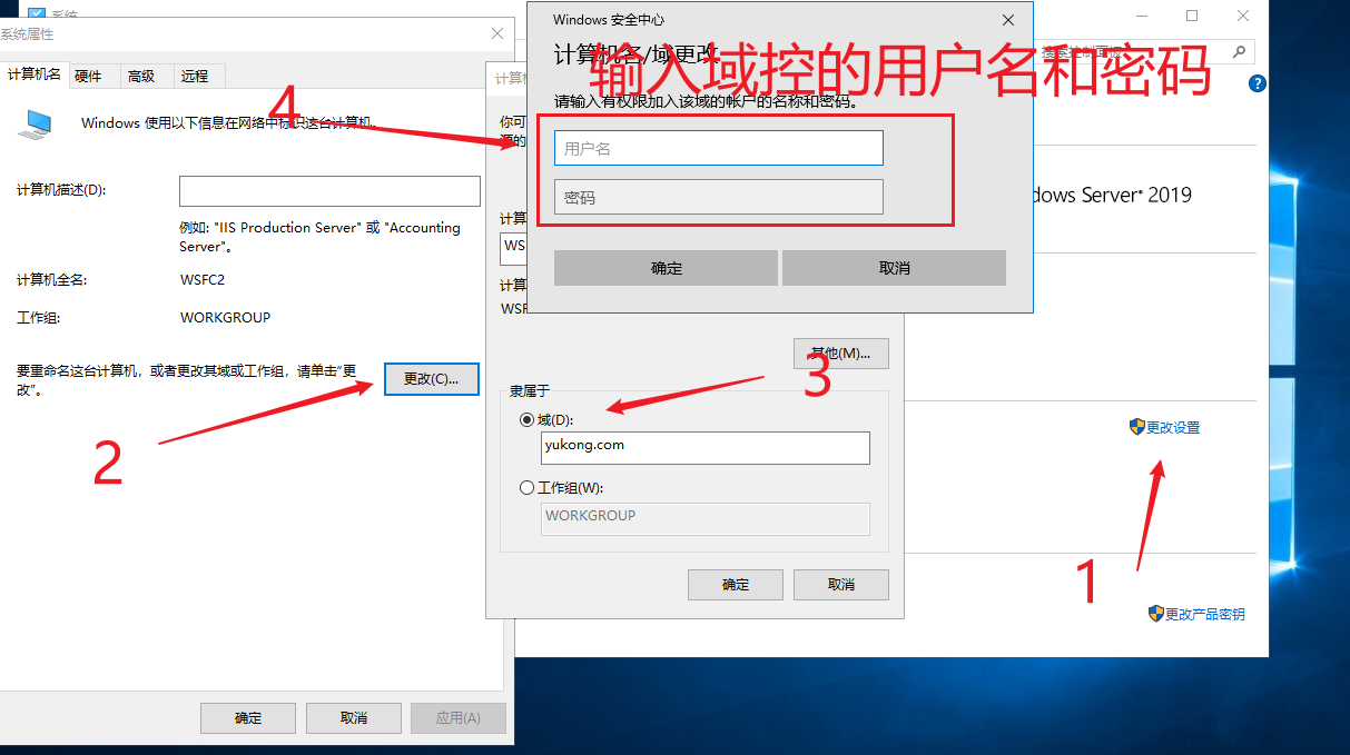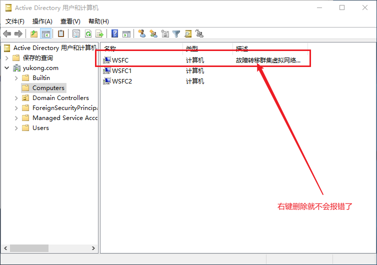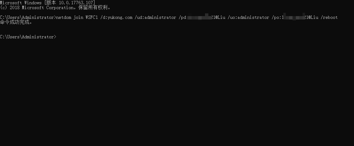 Ⅱ、在域控端使用命令添加netdom join WSFC1 /d:yukong.com /ud:administrator /pd:@Liu /uo:administrator /po:@Liu /reboot