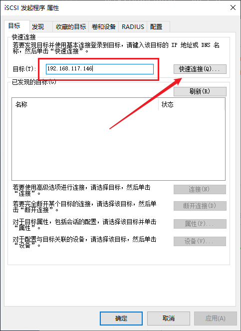 连接iscsi存储,存储我是用iscsi搭建的共享存储,连接很方便,输入存储IP,点击快速链接就可以,两台都要连接