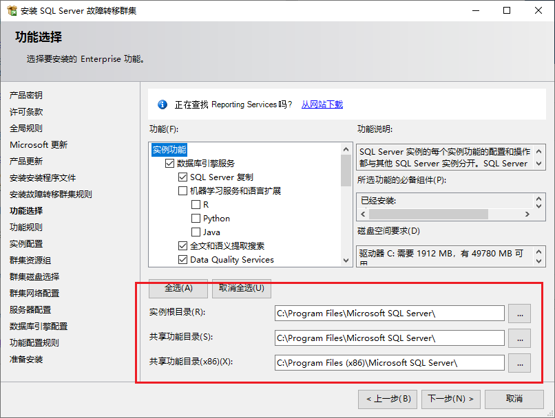 安装需要的功能,安装路径要和故障转移集群一致,如果之前加入故障转移集群,在这里选Z盘会报错,而选择其他盘符,创建alwayson又会报目录路径的错误