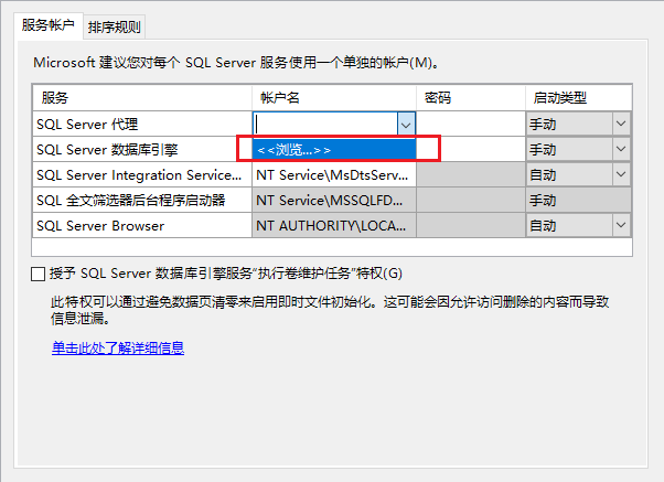 设置sqlserver服务的账户为域控账户,我用的是域控管理员,也可以单独设置一个账户用来管理数据库